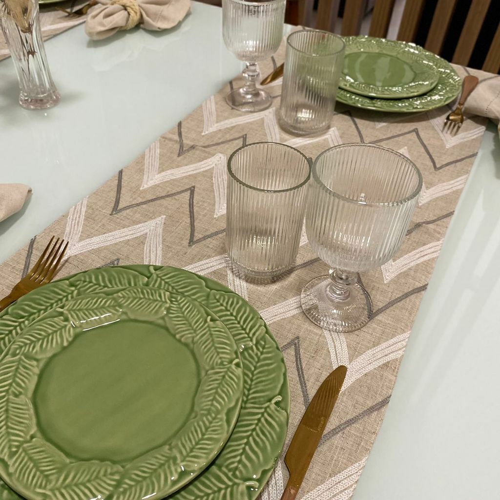 A cor fendi combina perfeitamente com o bordado branco e cinza, criando um contraste que encanta. Ideal para jantares especiais ou para o dia a dia, ele traz um charme inigualável à sua decoração.