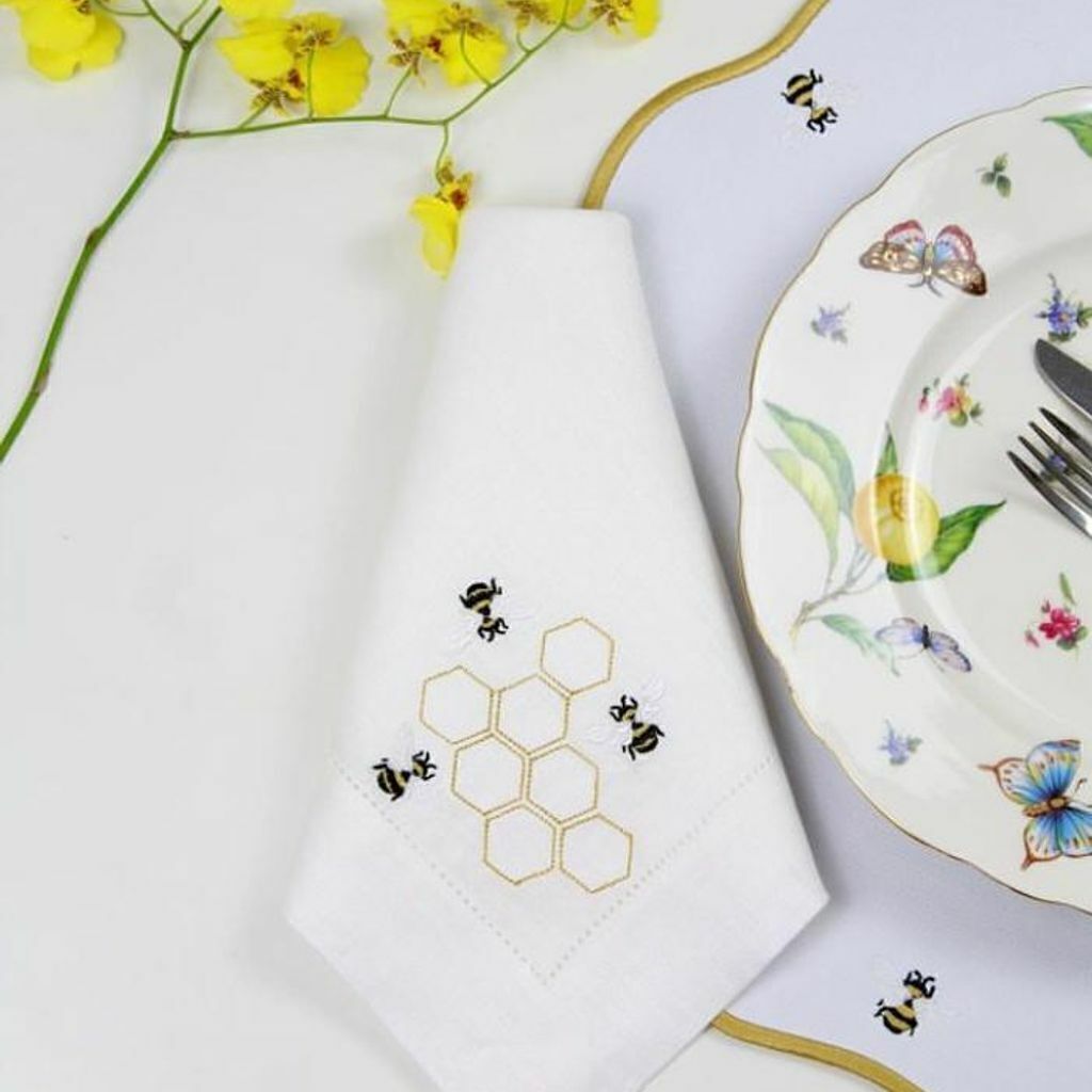 Guardanapo de Linho Branco com Bordados Abelhas 43x43 cm